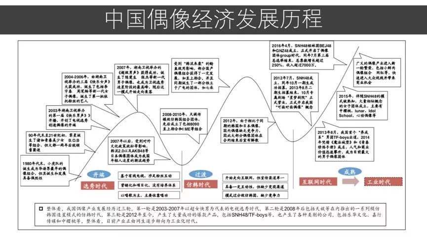 第一轮是2003-2007年以超女快男为代表的电视选秀年代;第二轮是2008年今后以天娱等公司为代表进入了仿韩年代;第三轮是2012年今后,发生了TFboys、SNH48等爆款年代,开端进入了的工业化出产年代。